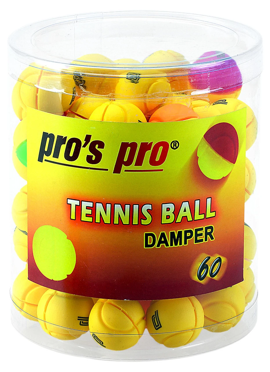 Pro’s Pro Tennis Ball String Dampener is a small tennis ball shaped dampener in an assortment of colours to help in absorbing shock.